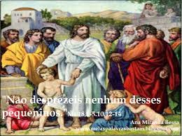 Naquele tempo, 1 os discípulos aproximaram-se de Jesus e perguntaram: “Quem é o maior no Reino dos Céus?” 2 Jesus chamou uma criança, colocou-a no meio deles 3 e disse: “Em verdade vos digo, se não vos converterdes, e não vos tornardes como crianças, não entrareis no Reino dos Céus. 4 Quem se faz pequeno como esta criança, este é o maior no Reino dos Céus. 5 E quem recebe em meu nome uma criança como esta é a mim que recebe. 10 Não desprezeis nenhum desses pequeninos, pois eu vos digo que os seus anjos nos céus veem sem cessar a face do meu Pai que está nos céus. 12 Que vos parece? Se um homem tem cem ovelhas, e uma delas se perde, não deixa ele as noventa e nove nas montanhas, para procurar aquela que se perdeu? 13 Em verdade vos digo, se ele a encontrar, ficará mais feliz com ela, do que com as noventa e nove que não se perderam. 14 Do mesmo modo, o Pai que está nos céus não deseja que se perca nenhum desses pequeninos”.
